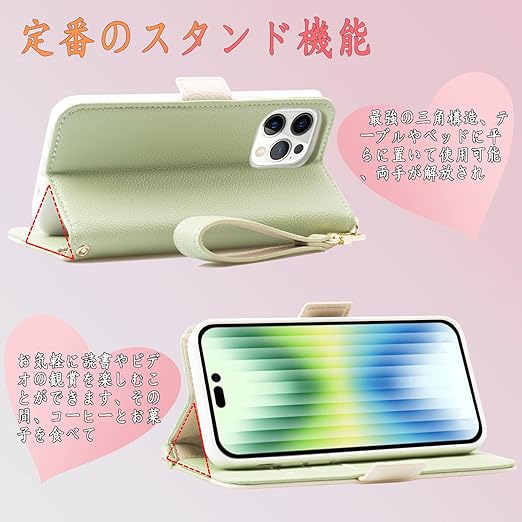 iPhone 14 Pro ケース 手帳型 女性へのプレゼント iPhone14 Pro カバー 手帳 専属ストラップ iPhone 14 プロ スマホケース サイドマグネット スタンド機能付き アイフォン14 Pro 手帳型ケース カード収納 アイフォン14 プロ 財布一体型ケース おしゃれ 軽量 便利 iPhone 14 Pro用 6.1インチ対応 S3 グリーン a