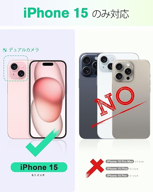 【対応機種】iPhone 15(2023年発売6.1インチ)のみ対応します。他の機種は対応しません。対応機種を十分ご確認の上、ご注文頂きますようお願い申し上げます。