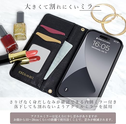 【 CECIL McBEE 正規品 】 iPhone 16 ケース 手帳型 ミラー付き セシルマクビー 「 キルティンク? 手帳ケース 」カード収納 6.1インチ アイフォン16 iPhone16 用 ブランド スマホケース (ブラック, iPhone 16) a