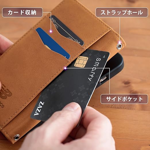 【特徴】・開閉サポート付き ・内部ケースはTPU ・簡易スタンド機能付き ・カード収納×2ヶ ・サイドポケット収納×1ヶ ・ストラップホール付き