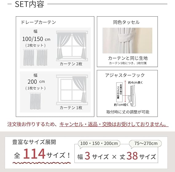 ●114サイズ展開/幅:100/150/200cm/丈:75~270cmの間で5cm刻み/※ただし、丈170~200cmの間は、丈178・185・192です。丈175、195cmはご用意しておりません/※幅100・150cmは2枚