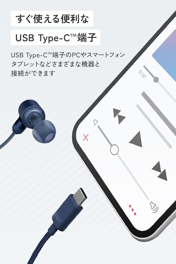 【USB Type-Cプラグを採用、高音質デジタル接続に対応※する有線タイプ】 スマートフォン、PCやタブレットなど、さまざまな電子機器との高音質デジタル接続に対応※。有線接続のため、音の途切れや遅延がほとんどなく、動画視聴やゲームアプリなども快適に楽しめます。また、プラグ部に指がかりしやすいデザインを採用し、抜き差しのしやすさにも配慮しています。 ※全ての機器での動作を保証するものではありません。一部の機器ではUSBホストもしくはOTG機能の設定が必要です。一部の機器の初回使用時は音量が最大
