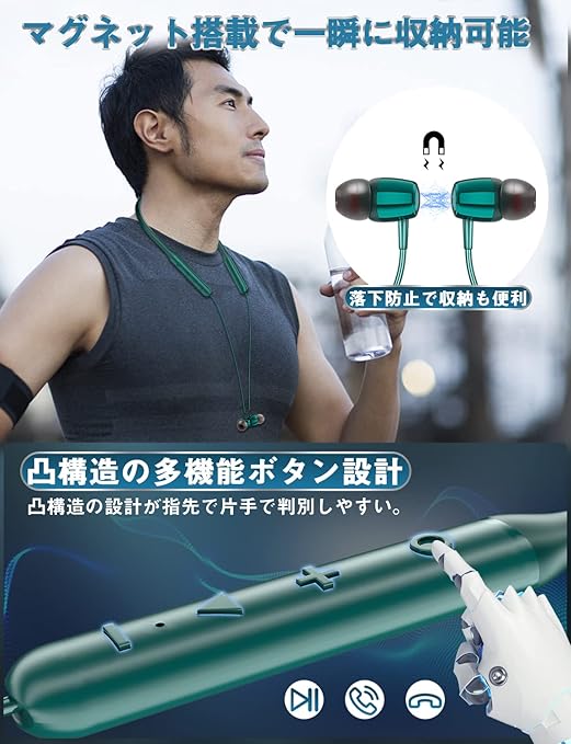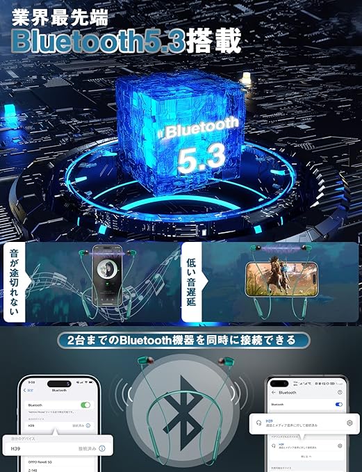 ◆史上最も長い・38時間連続再生ネックバンド型イヤホン登場◆ 【最先端bluetooth5.3チップ・大容量バッテリー】最先端のBluetooth5.3技術を採用されて、接続性がよく安定して、通信スピード、通信範囲とも向上にしました。従来品と比べると高速で移動する際にも、遠距離の空間にも、従来品より「音飛び」や「音切れ」」などの状況も改善できます。省エネルギーの大容量バッテリーがダブル搭載されているため、1回のフル充電で最大約38時間連続再生できて、普通のbluetoothイヤホンより2倍以上実