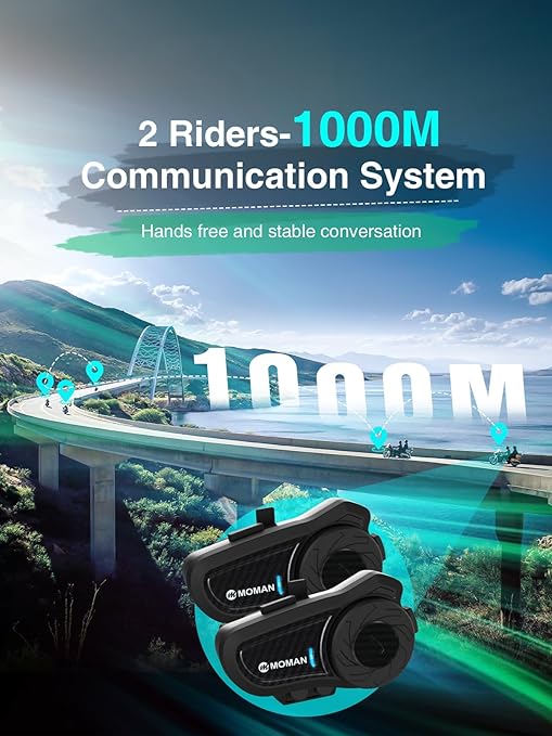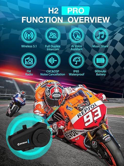 Moman Motorcycle Helmet Headsets, H2 Wireless Helmet Intercom【2 Pack】 Communication System with Noise Cancellation Music Control Answer Call for Dirt Bike, Motorbike-Wireless-Helmet-Intercom-Headset a