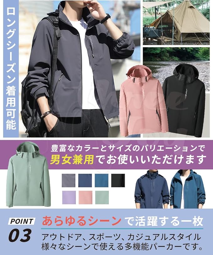 [three Joy] 【男女 アウトドアジャケット】マウンテンパーカー ウィンドブレーカー ファスナー 裏メッシュ 着脱フード 男女サイズ M〜2XL c