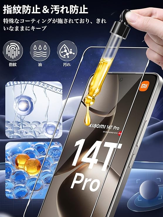 【適用機種】Xiaomi 14T Pro 対応のガラス保護フィルム(2枚)とレンズフィルム(2枚)です。スマホの液晶画面やカメラレンズどちらも保護できます。