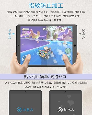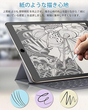 【紙のような描き心地】iPad Air3 フィルムの正面に日本からの高密度素材を採用しており、紙の摩擦と抵抗があるので、iPadユーザーが紙に描くような感覚を提供して、書く、描画、ノートの書き込みなど書くことに集中できます。なお、ペーパーフィルムはApple pencilと交換性が有ります、大幅にペン先磨耗防止、Apple Pencilでのストロークが