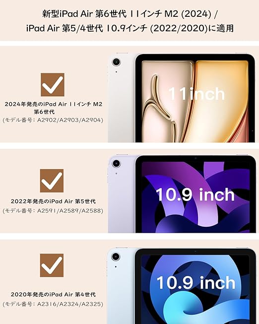 「対応機種」2025年新発売のiPad Air 11インチ(M3)第7世代(モデル番号:A3267、A3270)、2024年発売のiPad Air 11インチ(M2)第6世代(モデル番号:A2902、A2903、A2904)、2022年発売のiPad Air 第5世代(モデル番号:A2591、A2589、A2588)及び2020年発売のiPad Air 第4世代(モデル番号:A2316、A2324、A2325、A2072)10.9インチタブレットにカスタム設計しており、iPad(A16)第11世