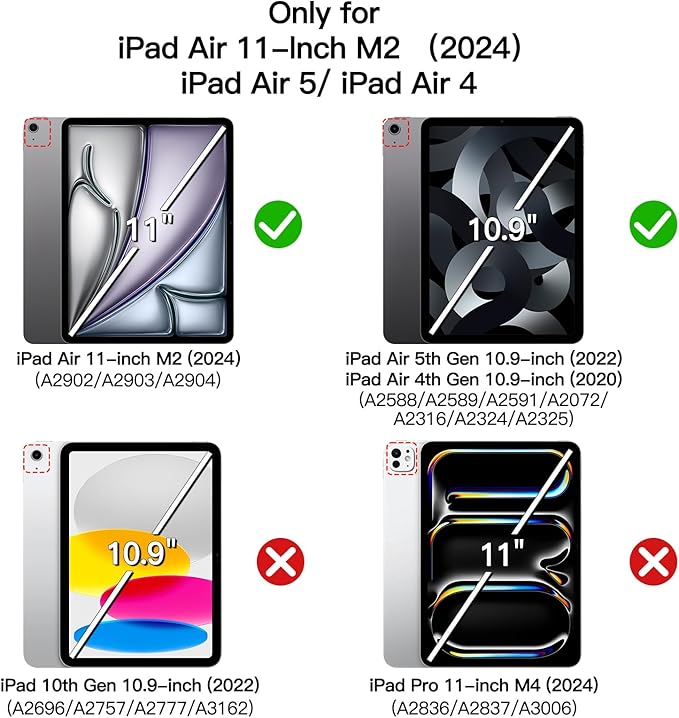 [互換性] Pencil Pro/Pencil(USB-C)に対応。iPad Air 11インチ M3/M2 (2025/2024) 、iPad Air5/4(2022/2020 10.9インチ)専用保護ケース。適合iPadモデル: A2902 A2903 A2904 A2588 A2589 A2591 A2324 A2072 A2316 A2325。Pencil Pro/Pencil(USB-C)に対応。ご注意:iPadの他のモデル(例えiPad Air 13インチ M2、iPad Air 3