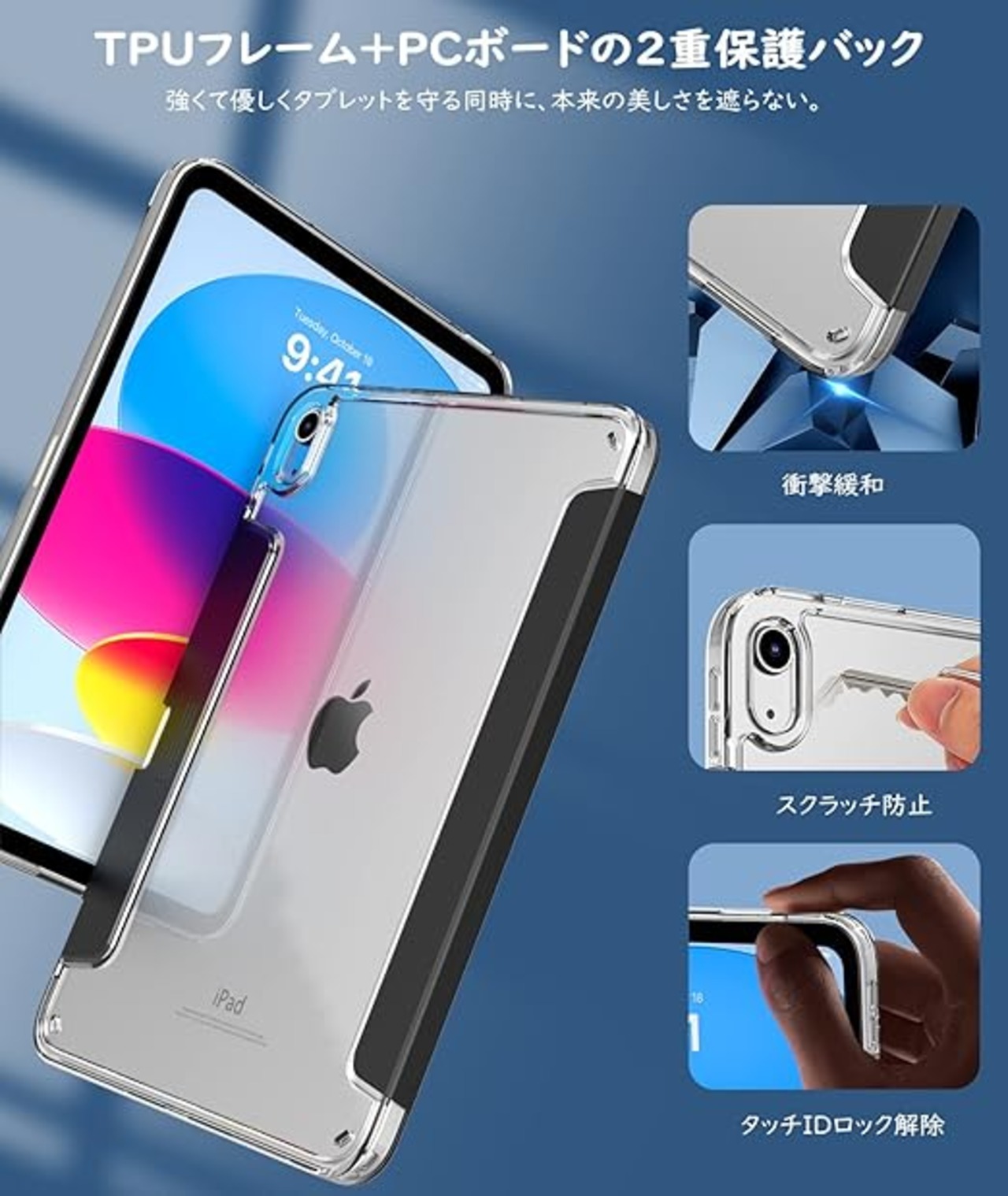 「対応機種」 2025年新発売のNew iPad 11インチ 第11世代 (A16)(モデル番号:A3355/A3356)、2022年発売の iPad 10.9インチ 第10世代(モデル番号:A2696/A2757/A2777)にカスタム設計しており、iPad Air 10.9 第5/4世代(x)、iPad Air 11 第7/6世代(x)、又は他のモデルには適用しません。ご購入の前にお手元のタブレットの機種/モデル番号を予めご確認ください。