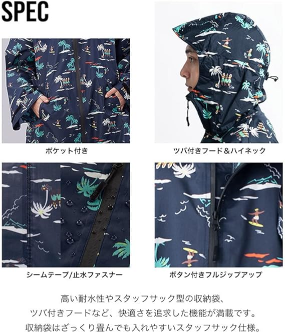 フード部分はツバ付き・ハイネック仕様、調節可能なドローコード付