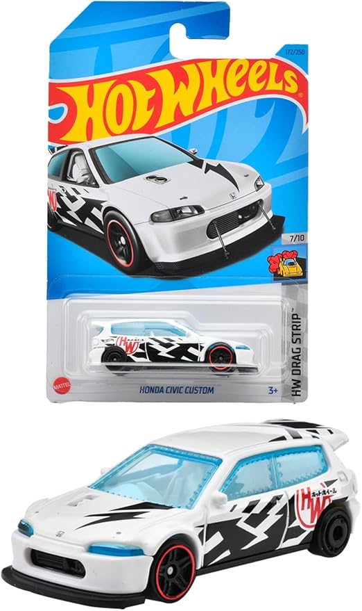 【内容】1991年に登場した5代目シビック。北米市場では、ティーンエイジャーが憧れる日本車として圧倒的な人気を博した。チューナーと呼ばれる改造車ファンにも愛され、ストリートからサーキット、ドラッグレース場まで、あらゆるシーンでシビックを見かけることになった。ホットウィールでは1/4マイルをいかに速く走るかを競うドラッグレース仕様をモチーフにしている。一番の特徴は、駆動輪(前輪)がエンジンの大パワーを効率よく路面に伝えるために後輪よりも太くなっている点。ワイド化されたフェンダーやリベット留めになっ