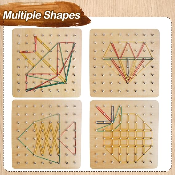 幾何学的なボード:この木製ジオボードには、64個の釘、24枚のパターンカード(空のカード5枚、幾何学的なカード19枚を含む)、ラテックスバンドパックが付属しており、無限の創造的な遊びに必要なすべてを提供します。 ボードのサイズは7 x 7 x 0.6インチで、重さは12オンスで、多用途で持ち運び可能な学習ツールです。