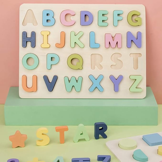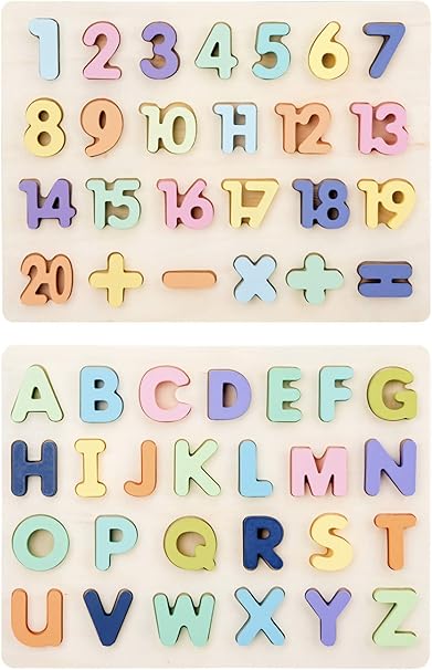 ABCパズルと数字パズルの2点セット。英語や数字のお勉強を始めるのにおすすめ。楽しく遊びながらアルファベットをしっかり学べます。カラフルで見た目も可愛い、温かみのある木製パズルです。
