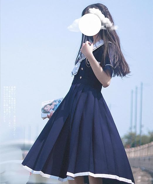 GSYCL セーラー服 ワンピース 半袖 紺色 ホワイト 女子高生 3点セット ハロウィン 衣装 JK 制服 コスチューム ロングスカート ネクタイ ベルト ボタン 女子制服 写真 撮影 文化祭 学?歳 卒業式 可愛い 森ガール (M, ブルー) a