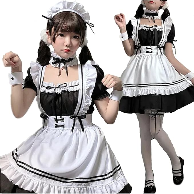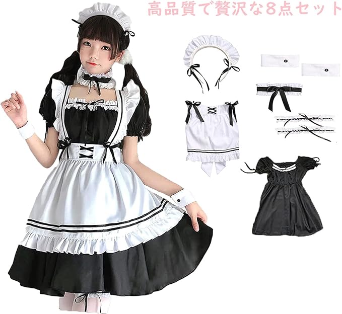 [JUNDOMECY] メイド ロリータ コスプレ 可愛い 4色展? 清楚 メイド服 8点セット ゴスロリ ワンピース 黒 ピンク 水色 赤 大きいサイズ 半袖 フリル ウェイトレス ドレス ハロウィン イベント パーティー a