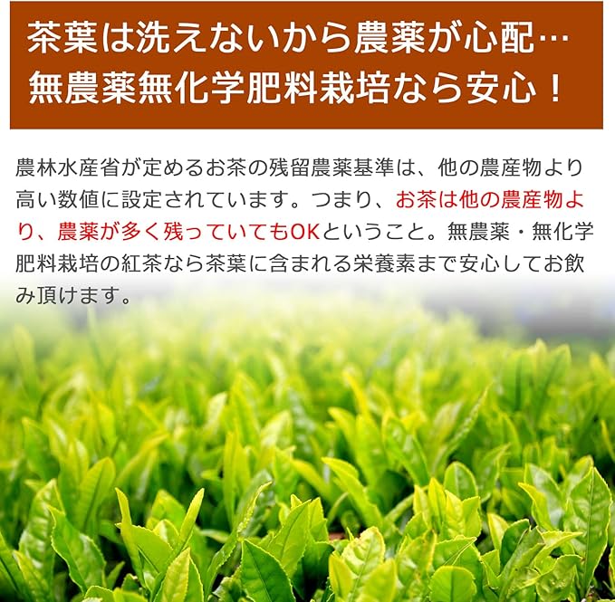 無農薬・無化学肥料栽培の静岡茶のみ使用し、すっきり飲みやすい紅茶ティーバッグに仕上げました。