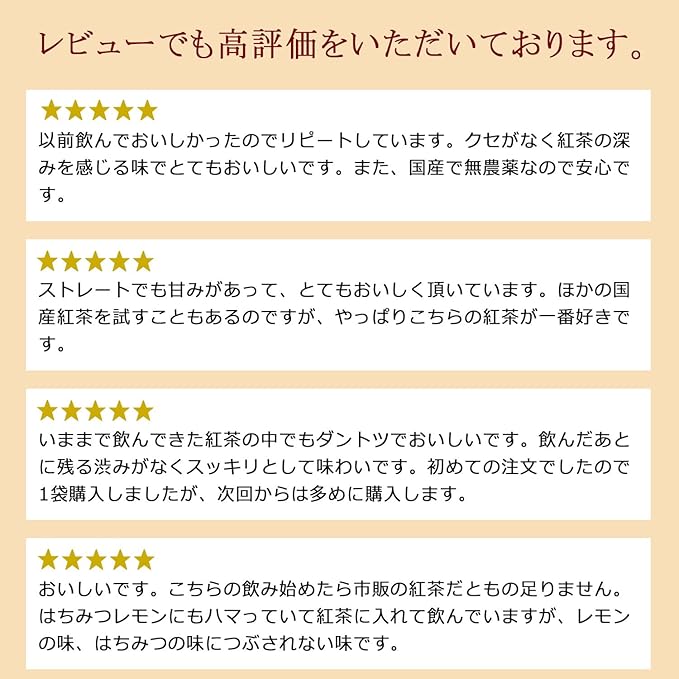 国産紅茶を多くの方に飲んで頂きたいと試行錯誤を繰り返し作られた商品です。クセがなく紅茶の深みを感じる味に仕上がっています。