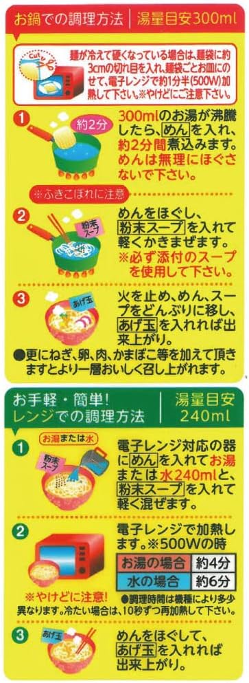 めん〔小麦粉(国内製造)、食塩〕、添付調味料(食塩、砂糖、鰹節エキス、粉末しょうゆ、蛋白加水分解物、昆布エキス)、かやく〔あげ玉(小麦粉、植物油脂、澱粉、えび粉、食塩)、わかめ、えび、ねぎ〕/加工澱粉、調味料(アミノ酸等)、pH調整剤、膨張剤、カラメル色素、酸味料、紅麹色素、酸化防止剤(ビタミンE)、(一部に小麦・大豆・えび・さばを含む)