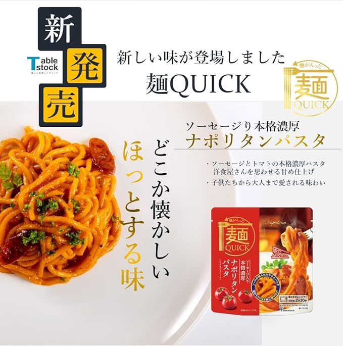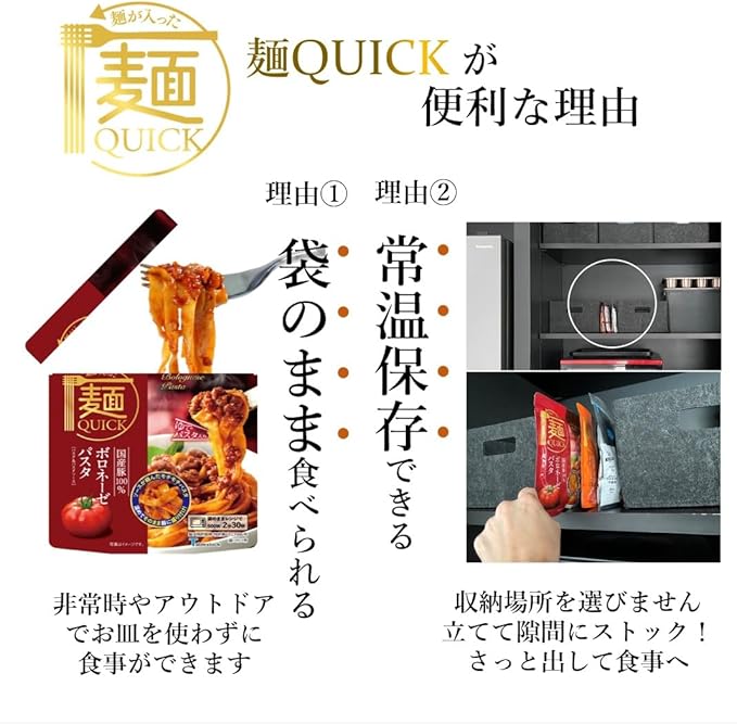 「麺QUICK」パスタは電子レンジ(500W:2分30秒)で温めるだけ(湯煎も可)で手軽に食べられる本格パスタです。常温で保存できるので、忙しい毎日の常備食に、いざという時の備蓄食に、便利でおいしいストック食として活躍します。