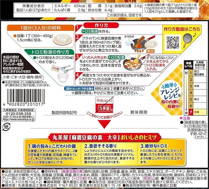 [麻婆豆腐の素]鶏肉、砂糖、豆板醤、醤油、米酢、食塩、エキス(帆立、チキン、ポーク、酵母)、大豆油、たん白加水分解物、ごま油、甜麺醤、豆豉醤、香味油、辣醤/調味料(アミノ酸等)、カラメル色素、香辛料抽出物、酸味料、甘味料(ステビア)、(一部に小麦・ごま・大豆・鶏肉・豚肉を含む) [トロミ粉]でん粉、生姜粉末、ねぎ、にんにく粉末 [別添]山椒