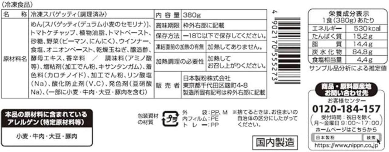 栄養成分:1食あたり(エネルギー)530Kcal(たんぱく質)15.2g(脂質)14.4g(炭水化物)84.8g(食塩相当量)4.4g