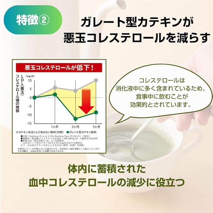 「体脂肪・コレステロールが気になる方に!」。緑茶をまるごと粉砕した、粉末緑茶(スティックタイプ)です。 「体脂肪を減らす」「LDLコレステロールを減らす」機能があることが報告されている機能性関与成分ガレート型カテキンを含む、機能性表示食品(トクホ)です。