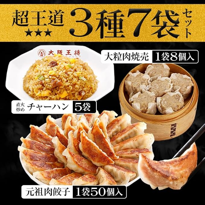 【商品内容】・元祖肉餃子50個(850g)×1袋 ・餃子のタレ×6袋 ・大粒肉焼売8個 (240g)×1袋 ・直火炒めチャーハン(230g)×5袋