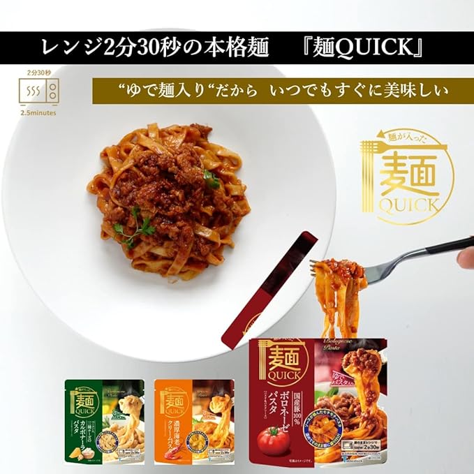 レンジで温めるだけ!麺とソース一体型の本格麺[麺QUICK]ボロネーゼ/海老クリーム/カルボナーラ のパスタ 3種✕各3(9食入)