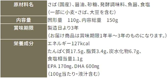 栄養成分表示:エネルギー127kcal たんぱく質17.5g、脂質3.4g、炭水化物6.7g、食塩相当量1.1g、EPA 170r、DHA 600r(100g当たり・液汁含む)