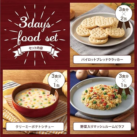 内容:27食(7種類、9缶)※特定原材料7品目|パイロットブレッドクラッカー(18枚)2缶、ポテトシチュー 1缶、マッシュルームピラフ 1缶、りんごシリアル 1缶、野菜シチュー 1缶、ミネストローネスープ 1缶、ミックス温シリアル 2缶、外箱1箱