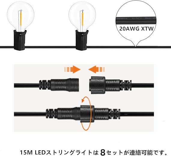 【商品仕様】コード長:約15m ソケット間隔:約55cm 防水仕様:IP44 電球消費電力:1W 色温度:2700K電球色 ビーム角:360º 電源:AC110V 50/60Hz ソケット個数:25個 重量:約1.8kg 使用温度:−20℃~40℃