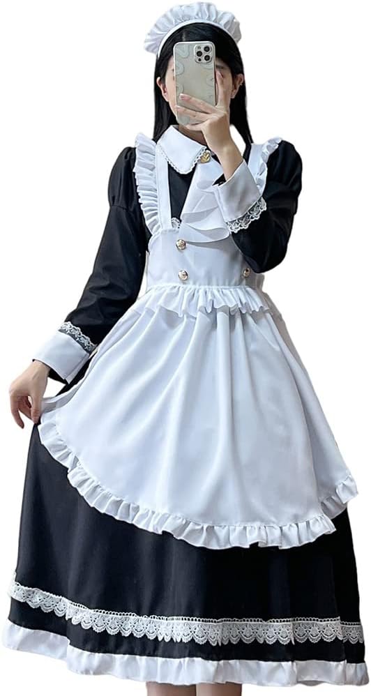 [YAISHN] メイド服 ロリータ ワンピース ゴスロリ 可愛い 正統 ドレス ロング 人気 ハロウィン 仮装 レディース コスプレ 長袖 蝶結ぶ パーティー イベント 演出服 カチューシャ ニーハイソックス 5点セット a