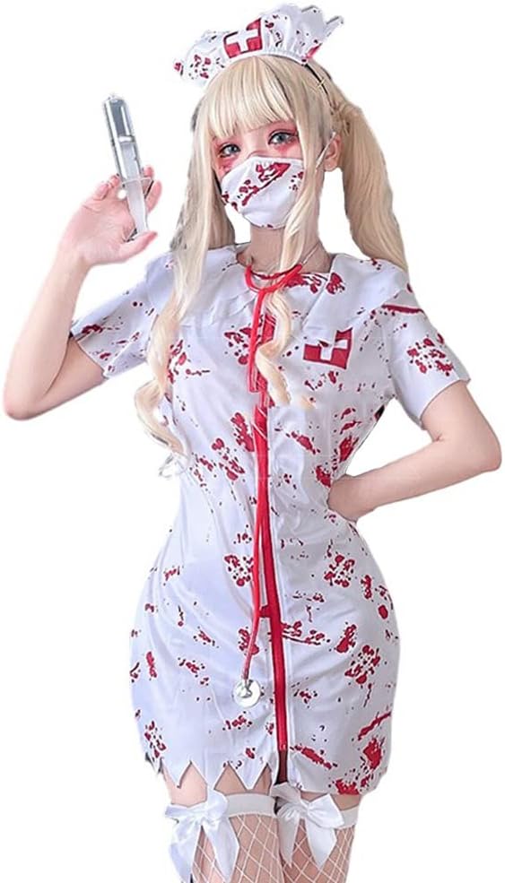[UPENC] ナース コスプレ 血まみれ マスク ハロウィン 仮装 ゾンビ 医者 看護婦 カチューシャ 可愛い レディース 大人用 ワンピース 網タイツ マスク付き a