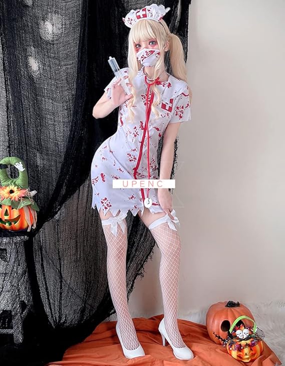 [UPENC] ナース コスプレ 血まみれ マスク ハロウィン 仮装 ゾンビ 医者 看護婦 カチューシャ 可愛い レディース 大人用 ワンピース 網タイツ マスク付き