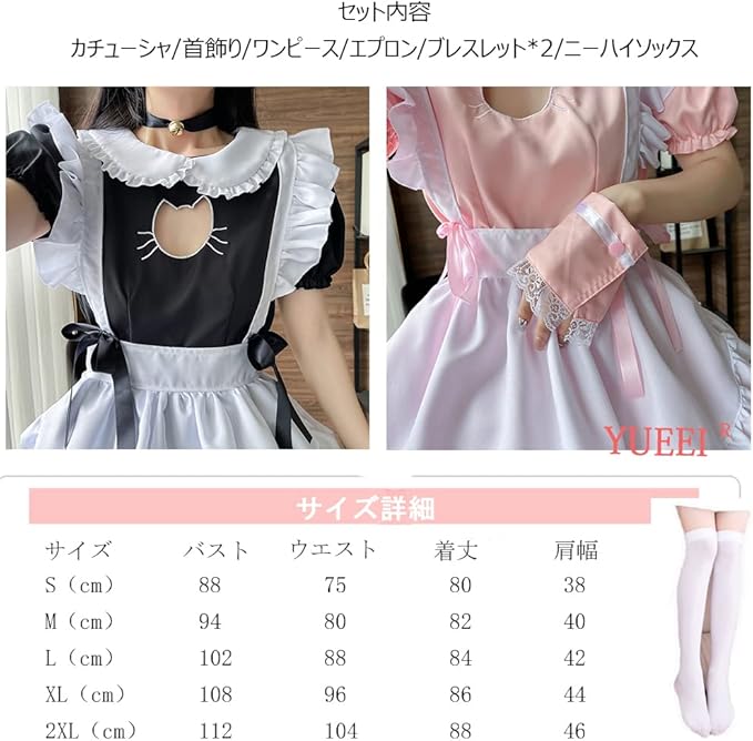 [YUEEI] メイド服 猫 胸空き レース コスプレ ハロウィン 仮装 ロリータ ワンピース 半袖 可愛い パーティー イベント カチューシャ 演出服 ニーハイソックス付き 5点セット