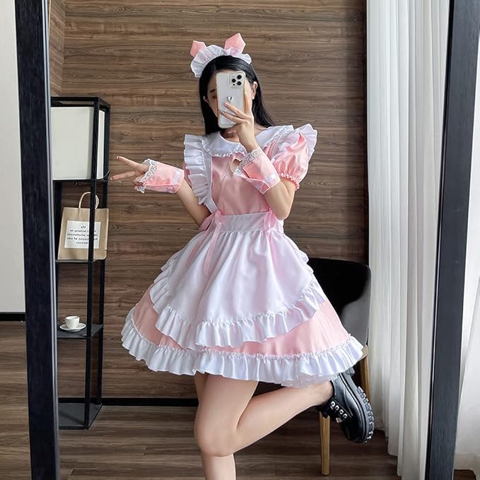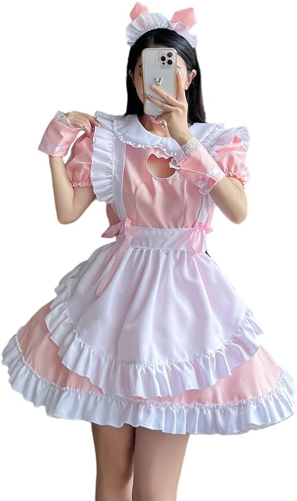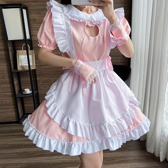 [YUEEI] メイド服 猫 胸空き レース コスプレ ハロウィン 仮装 ロリータ ワンピース 半袖 可愛い パーティー イベント カチューシャ 演出服 ニーハイソックス付き 5点セット a