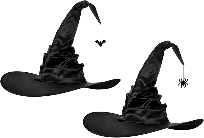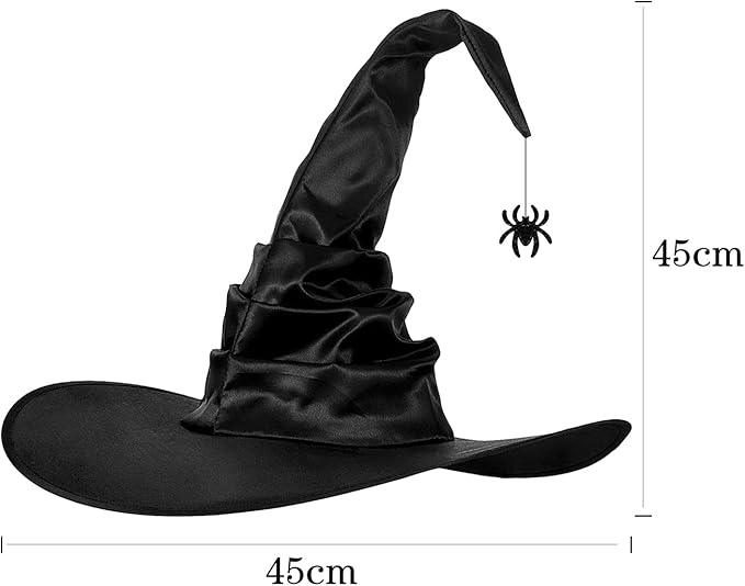 魔法使い帽子はお洒落なひだ折り縫い付けて、帽子チップにクモ/コウモリ吊り下げ、エレガント且つ神秘的なイメージを演出します。