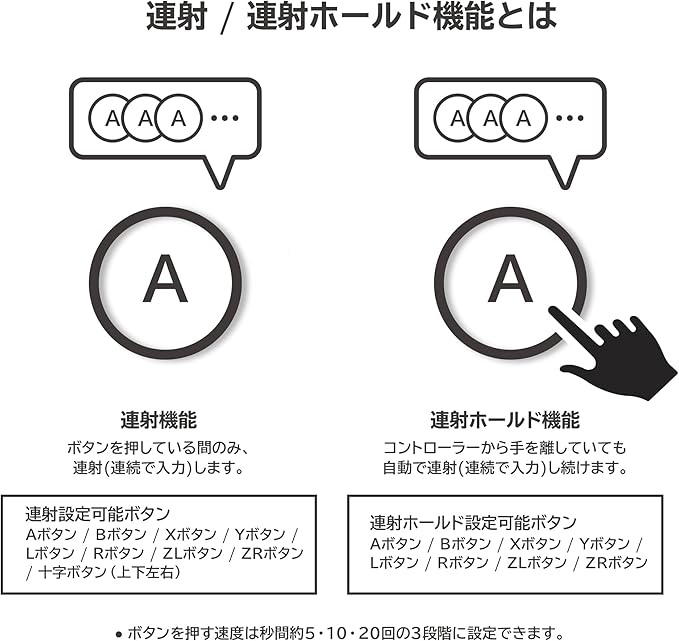 連射ホールド設定可能ボタン:Aボタン / Bボタン / Xボタン / Yボタン / Lボタン / Rボタン / ZLボタン / ZRボタン