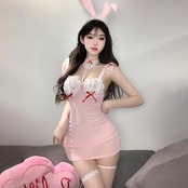 [YAISHN] バニーガール メイド服 エプロン ピンク ハロウィーン 仮装 胸あき セクシー コスプレ 逆バニー 肩出し 蝶結ぶ 過激 エッチ エロい 可愛い レディース 帽子付き 6点セット