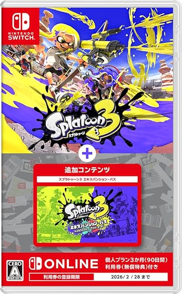 Nintendo Switchソフト『スプラトゥーン3』とその有料追加コンテンツ『エキスパンション・パス』が1つのゲームカードに収録されたパッケージです。