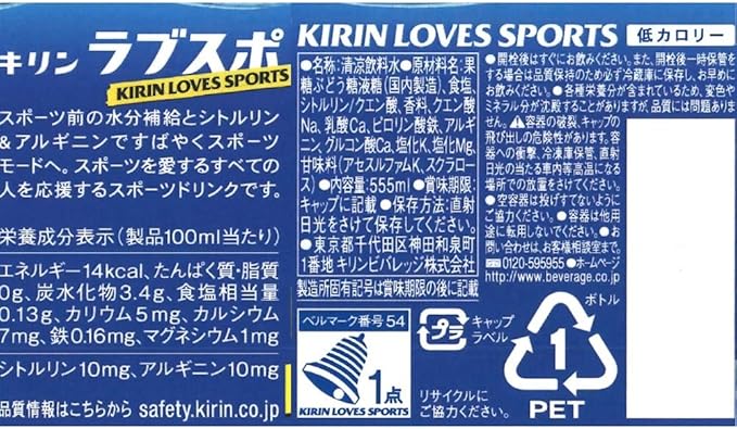原材料:果糖ぶどう糖液糖(国内製造)、食塩、シトルリン/クエン酸、香料、クエン酸Na、乳酸Ca、ピロリン酸鉄、アルギニン、グルコン酸Ca、塩化K、塩化Mg、甘味料(アセスルファムK、スクラロース)