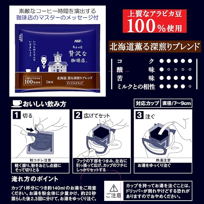 おいしい飲み方:対応カップ;直径/7~9cm1.軽く振り、粉を落とし点線にそって切りとる(粉こぼれにお気を付けください)2.フックの下部をつまみ、左右に引っ張って広げ、カップのフチにしっかりとセットする3.お湯をゆっくり注ぐ【淹れ方のポイント】カップ1杯分につき約140mlのお湯をご用意ください。お湯を粉全体に少量かけ、約20秒蒸らした後2、3回に分けて、お湯をゆっ