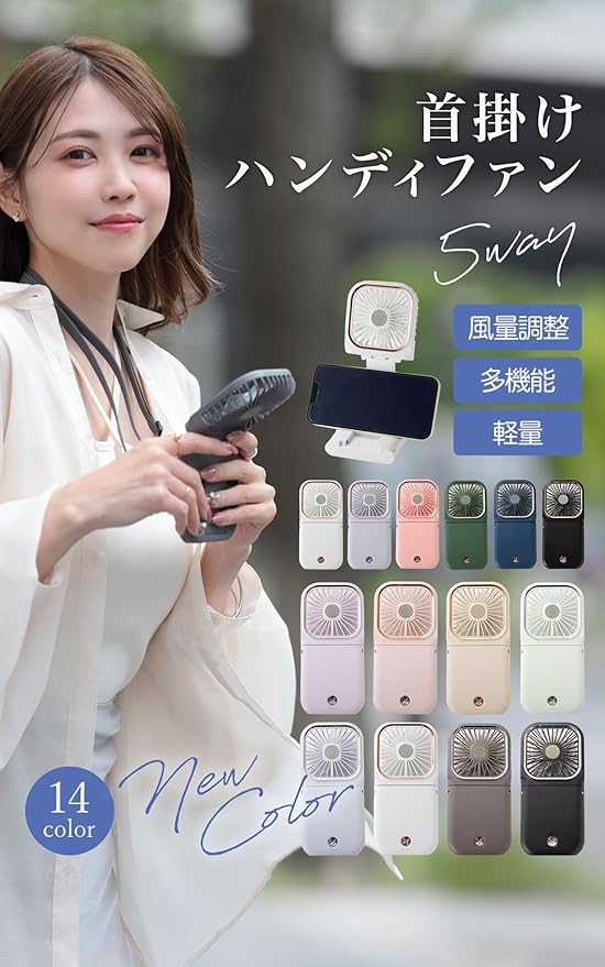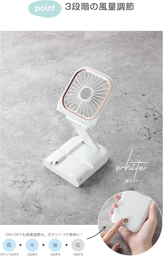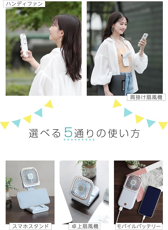 【ハンディファンだけではなく5通りの使い方】待ち合わせ時に ハンディファン として、手が離せない時に 首掛け扇風機 として、デスクワークや料理中の 卓上扇風機 として、3000mAhのモバイルバッテリーとして、 涼みながら スマホスタンドとしてもご利用可能です。