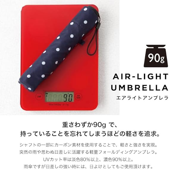 UVカット効果があるので雨傘としてだけでなく、日よけとしても使用できます。突然の雨や思わぬ日差しに活躍してくれる軽量フォールディングアンブレラです。