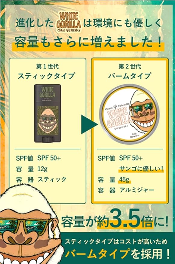 (White Gorilla) ホワイトゴリラ 【45g】 日焼け止め UV SPF50 + 南国ブラウン 褐色の日焼けした肌 小麦肌 専用 珊瑚を壊さない UV バーム ウォータープルーフ CORAL FRIENDRY マリンスポーツ サーフィン 落ちない日焼け止め メンズ (濃い茶色(Brown)) a