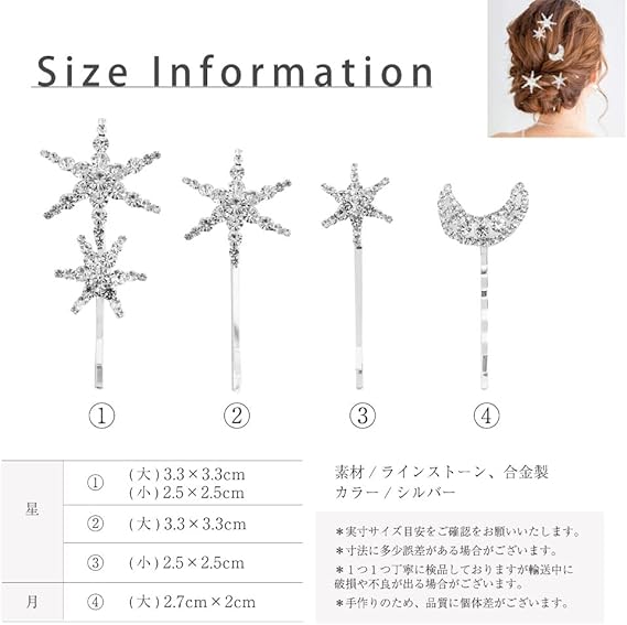 [Qroza] ヘアピン 4点セット 星 月 シルバー ムーン キラキラ ビジュー 輝き エレガント ウェディング 結婚式 前撮り ヘアアレンジ ヘアクリップ アメピン ヘッドドレス ヘアアクセサリー a