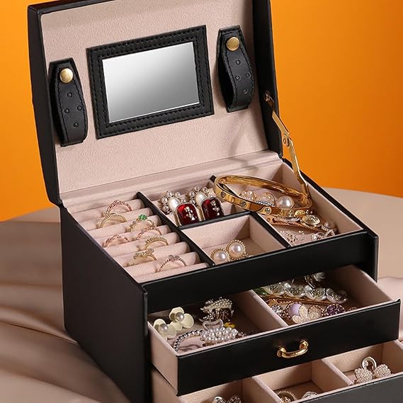 【Lumk】3段式 ジュエリーボックス アクセサリーケース ジュエリー収納 アクセサリー 収納 宝石箱 大容量 鍵 ミラー付き (BLACK) a