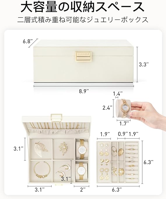 Vlando ジュエリーボックス 2層 大容量 取り外し可能 時計 ネックレス ピアス 指輪 ブレスレット 女性 プレゼント 誕生日 ギフト (ホワイト-plus) a