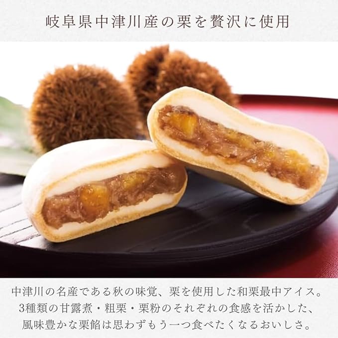 【岐阜県中津川の良質な栗】良質な栗が採れることで有名な岐阜県中津川の栗を贅沢に使用しています。中津川の栗は優しい甘みとしっかりとした味が特徴です。「和菓子あいす」をご堪能ください。